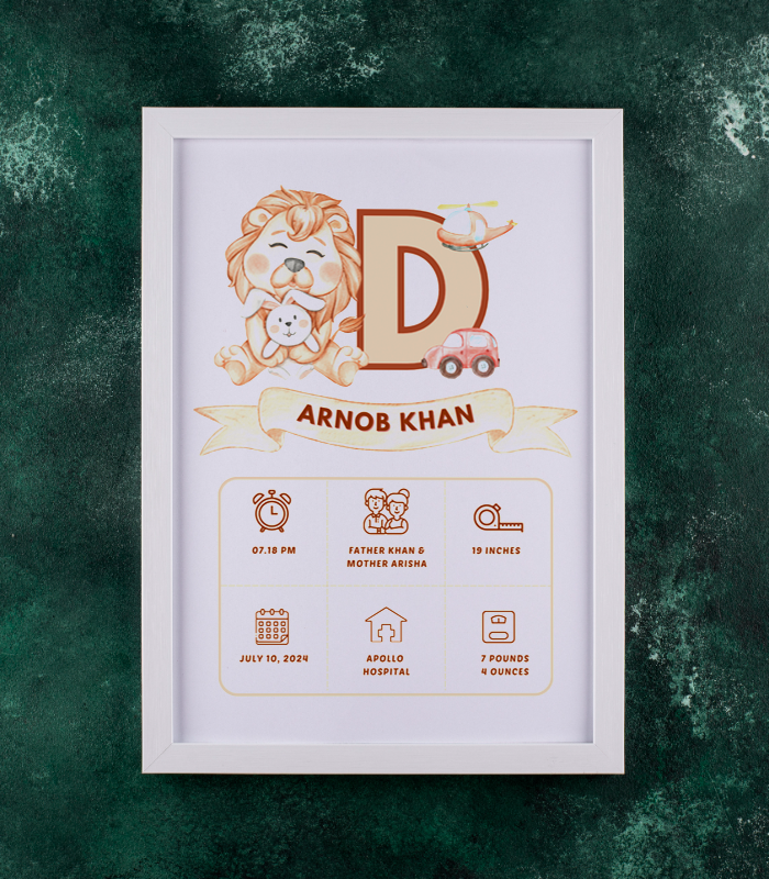 # Premium Baby Birth Stat Frame Celebrate your newborn's arrival with this elegant birth statistics frame. Designed to showcase your baby's vital details—name, date, time, weight, and length—in a sophisticated display piece that becomes a cherished keepsake. The premium construction ensures durability and timeless appeal, making it an ideal gift for new parents or a meaningful addition to a nursery. Personalize every element to match your home décor and preserve those precious first moments in style.
